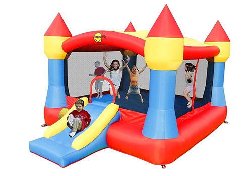 Die Hüpfburg wird gebrauchsfertig vermietet mit Gebläse, Tasche und Erdbefestigung.
